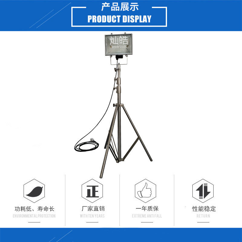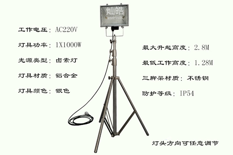 灿皓牌220V便携式升降工作灯由IP54级全铝灯具,由1个1000W飞利浦卤素灯光源和不锈钢可升降三脚架组成;具有使用寿命长、光效高、显色性好、携带方便等优点。被广泛用于;消防、事故现场、工程抢修、抗灾抢险、抗旱救灾、工地施工、生产车间、体育场等现场照明。适合全天候工作。