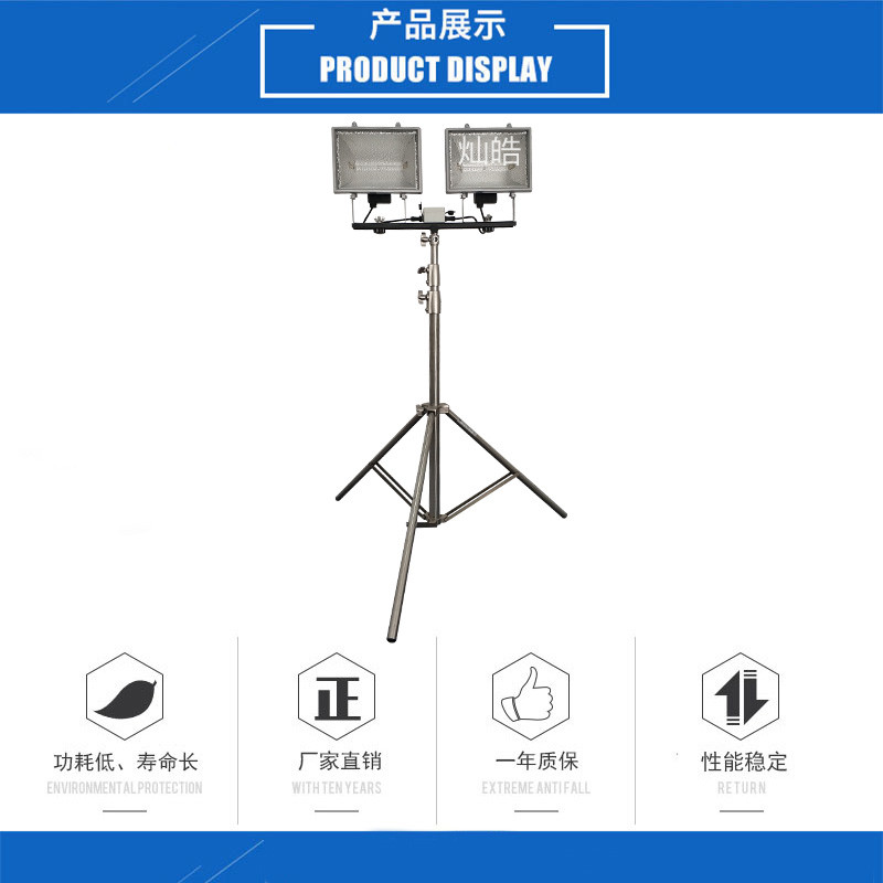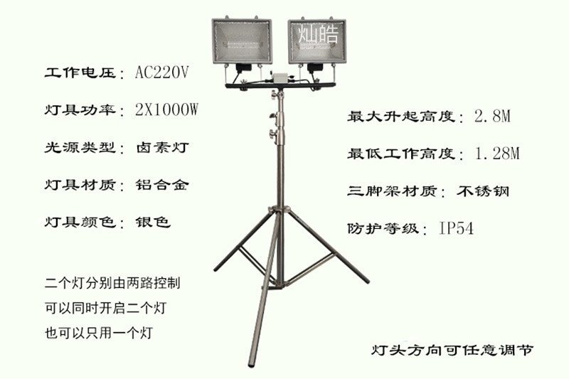 灿皓牌220V便携式移动工作灯由IP54级全铝灯具,由2个1000W飞利浦卤素灯光源和不锈钢可升降三脚架组成;具有使用寿命长、光效高、显色性好、携带方便等优点。便携式移动照明灯被广泛用于消防、事故现场、工程抢修、抗灾抢险、抗旱救灾、工地施工、生产车间、体育场等现场照明,