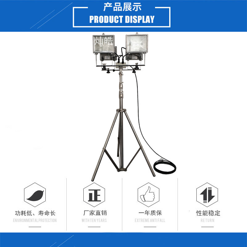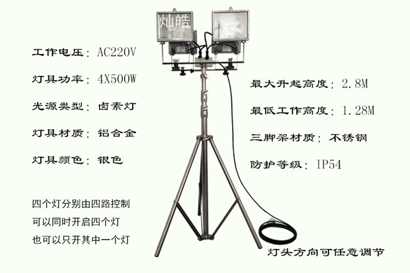 灿皓牌220V便携式升降工作灯由IP54级全铝灯具,由4个500W飞利浦卤素灯光源和不锈钢可升降三脚架组成;具有使用寿命长、光效高、显色性好、携带方便等优点。大功率移动升降式照明灯被广泛用于消防、事故现场、工程抢修、抗灾抢险、抗旱救灾、工地施工、生产车间、体育场等现场照明。适合全天候工作。