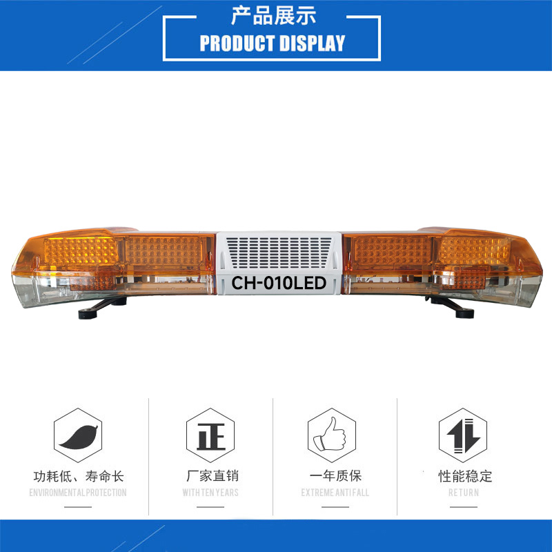 CH-010LED系列工程车全黄长排警示灯是我司自主设计开发,充分考虑运动学和力学,与车达到了很好的结合,整体效果充分显示了警车的威严与庄重。主光源配有12个高亮度LED发光模块 中网采用ABS材料模具压铸银色热喷涂处理,线条清晰 棱角分明 警示效果超前。
