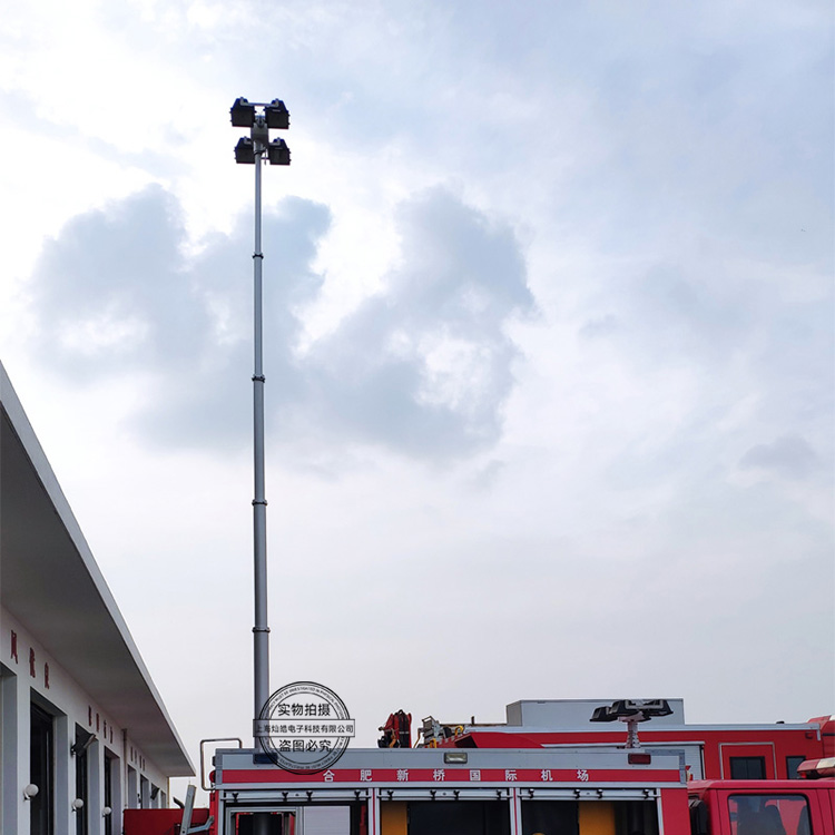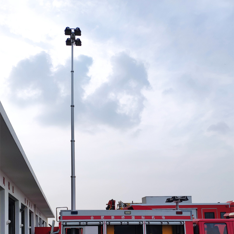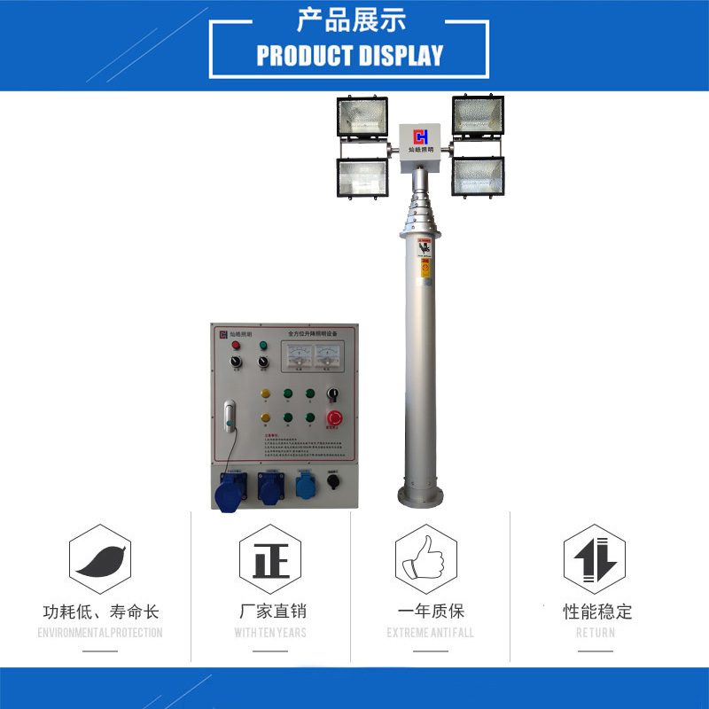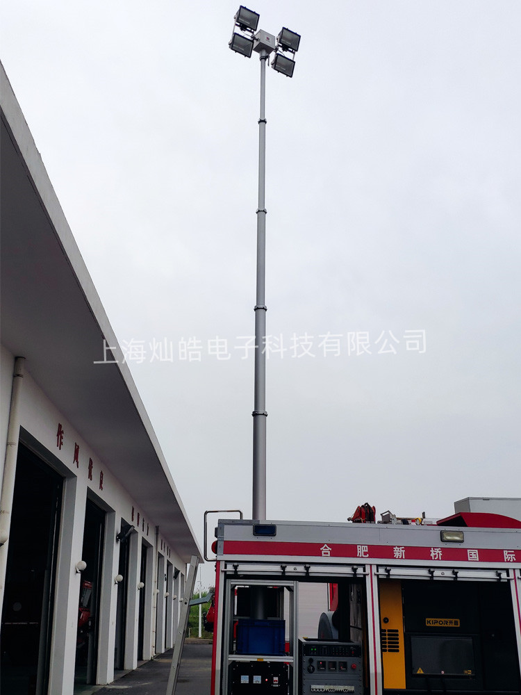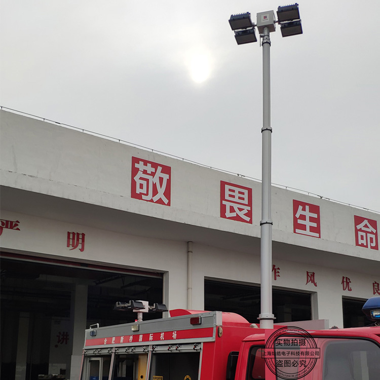 直立式升降照明灯由升降杆、云台、灯具、配电柜、遥控器、线控器等部分组成,4X1000W大功率车载升降照明灯可定制升起高度10米,云台可420度旋转,有效光照半径300米,主要配备于消防照明车、地质堪察车、公路抢险车、水电煤气抢修车上,为夜间抢险提供照明。