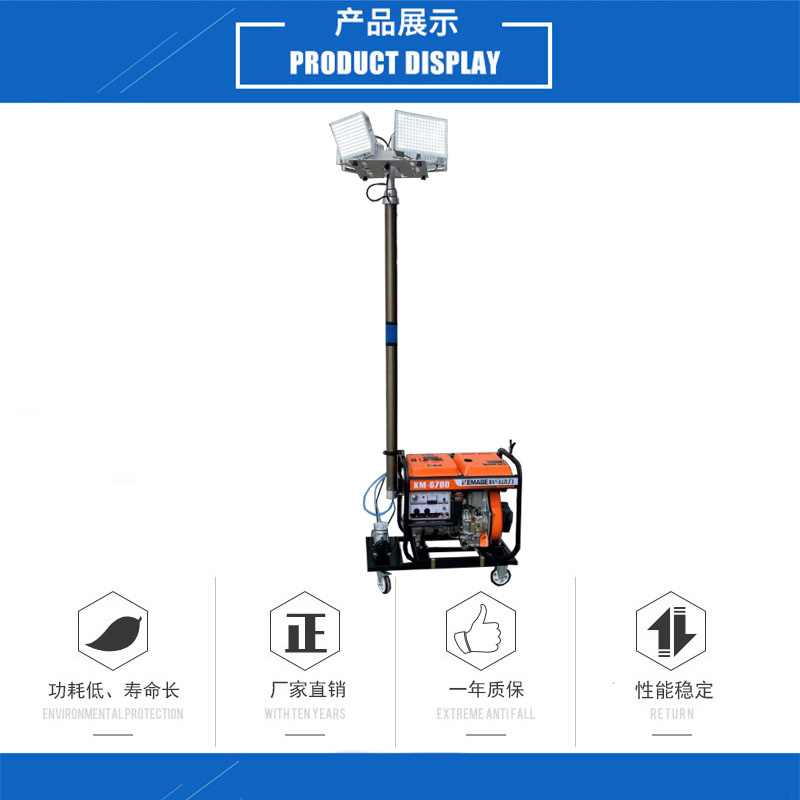 照射范围: 选用3节伸缩汽缸作为升降调节方式,升起高度为4.5米;上下旋转灯头可调节光速照射角度,灯头覆盖半径达到45米-65米。